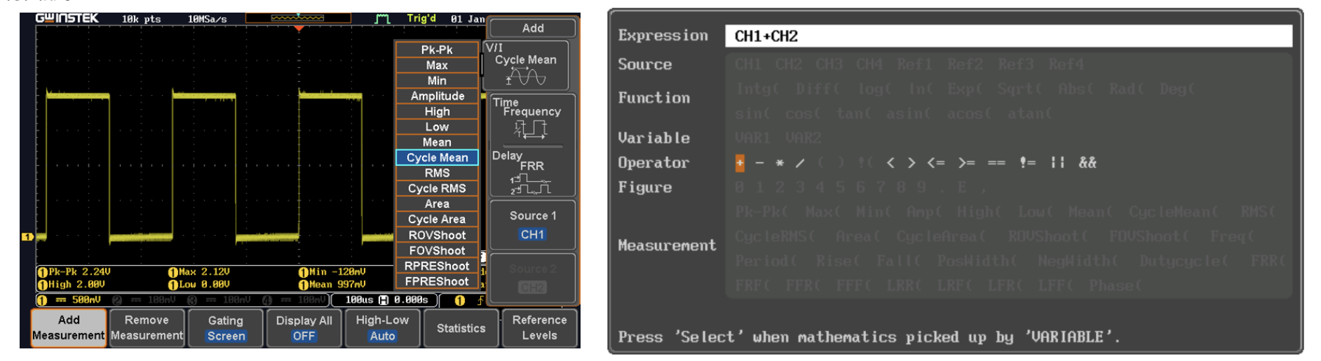 GDS-1000E 系列示波器提供36项自动测量参数可选择,实现多种专属量测功能。另外提供波形运算功能,基本数学运算:加、减、乘、除、FFT,以及高级数学运算,提供15种高级函数运算(Intg、Diff、log、Ln、Exp、Sqrt、Abs、Rad、Deg、Sin、Cos、Tan、Asin、Acos、Atan),提供函数/变量/数值/运算符/测量值等为基础的用户自定义数学函数公式(多达60种用户自定义波形函数参数设定)。