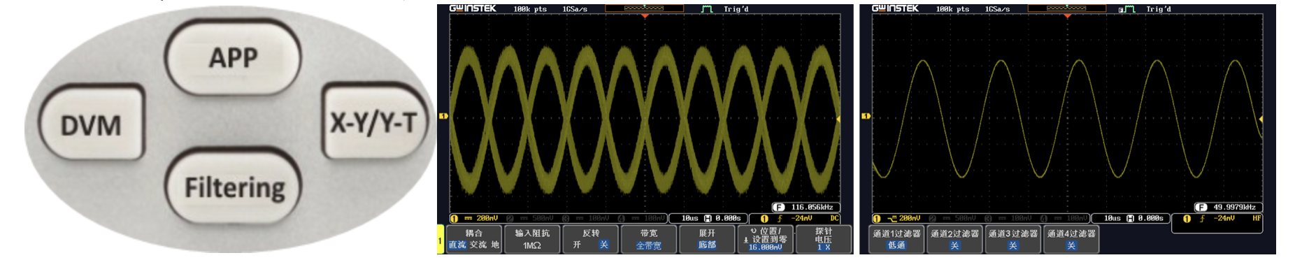 针对高校实验教学需求,GDS-1000E 系列示波器提供多种专属功能。提供探头补偿校准自动导引功能,给初学者带来-步步引导式探棒补偿教学。高校实验中常 用功能提供了4个专属实验1仿真快捷键:APP功能带来多款智能软件提供独有 的测量功能; DVM数字电压表; Filtering 数字滤波器可以设定每个通道独立设置 高通/低通/带通滤波器; X.Y/Y.T 快速XY模式- -键提供快速李莎育图形。